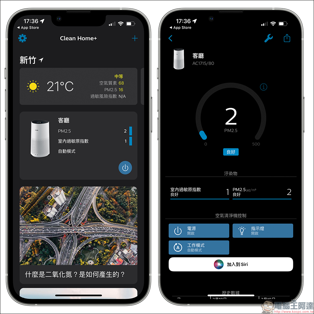 Clean Home+ App 主頁會顯示用戶當下環境位置的天氣、溫度、空氣品質狀況,讓用戶只需打開 App 就能查看。同時也會顯示連線的飛利浦空氣清淨機目前監測的 PM2.5、室內過敏原指數和運行模式。進入空氣清淨機的控制頁面後,簡潔好閱讀的介面設計讓人可一目瞭然所有想知道的空氣品質狀態,也能透過常用的幾種控制按鈕通過手機遠端控制電源開關、模式轉換與指示燈開關等設定。
