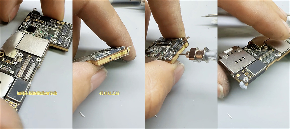 為了解決 iPhone 散熱問題,下一步就是改主機版。他直接為主機板添加大量散熱膏,但是灌的方式選擇直接鑽了許多孔,接著將散熱膏用針孔注射進去,直到其他孔的散熱膏都溢出就表示內部都被灌滿了。