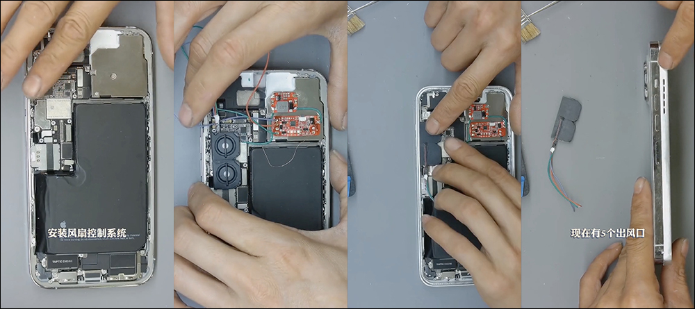 下一步他開始改風扇,為 iPhone 13 Pro Max 安壯獨立風扇和控制系統,加上加厚中框上鑽了多個出風口讓機身內部的熱源可從側邊排出。