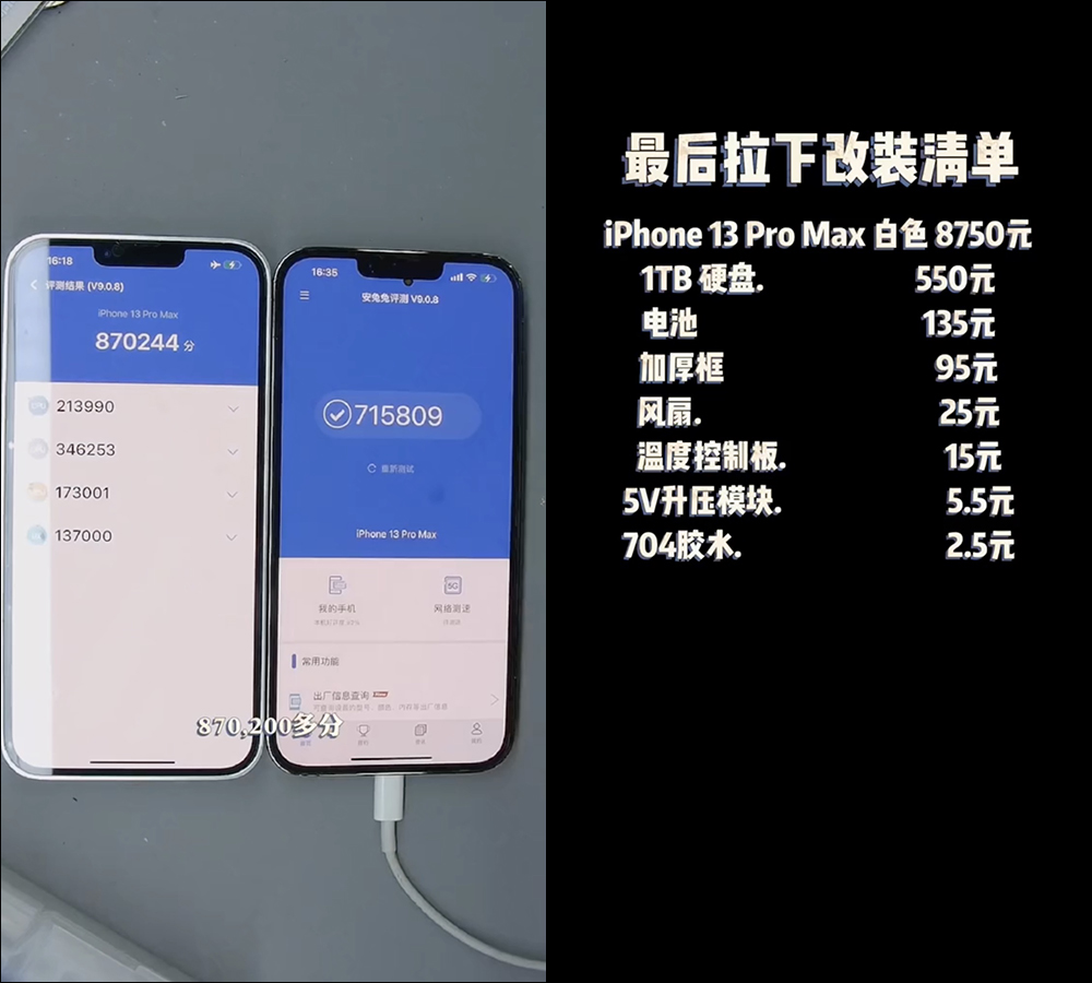 電量增加、散熱加強等改裝後, iPhone 13 Pro Max 的安兔兔跑分來到平均 87 萬分,足足比原本的提升 15.4 萬分。另外他也總結改裝的所有零件費用(幣值為人民幣)。
