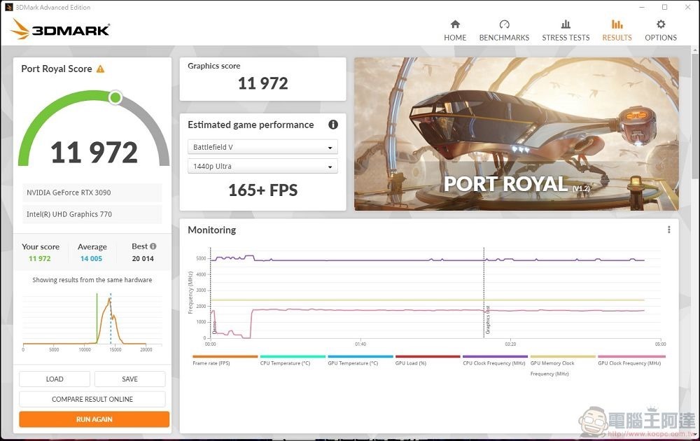 3DMARK PORT ROYAL 為DX12下的即時光線追蹤測試,採用預設設定預設為2K解析度的Battlefield V 1440P Ultra,總成績為11972分: