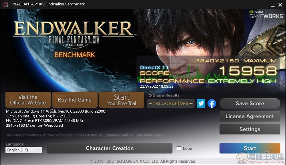 FINAL FANTASY XIV ENDWALKER設定4K解析度特效最高,得到15958分: