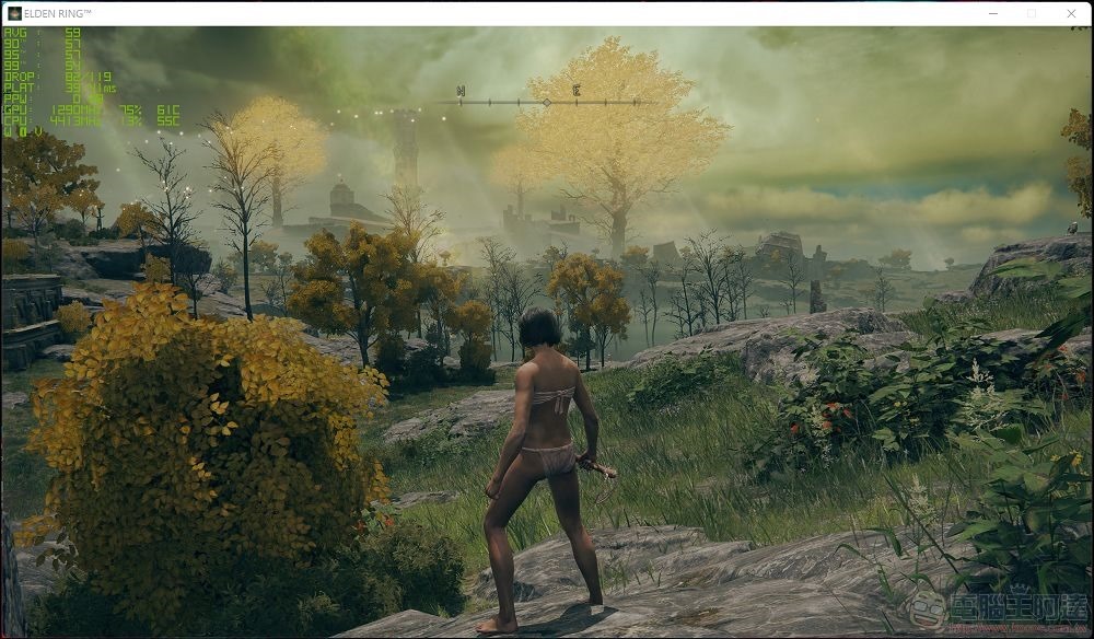 艾爾登法環設定4K解析度,全特效最高,死亡後場景的這顆樹應該是光線用最多的場景,這邊都平均都有60幀: