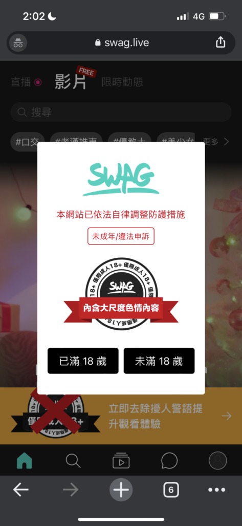 想觀看免費SWAG影片需先完成3 個步驟註冊或登入,第一個步驟是在「SWAG」,官網確認成年身份,點選「已滿 18 歲」。