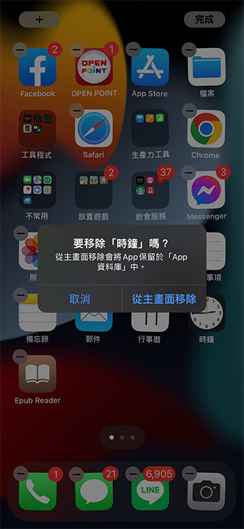 - 點擊目標應用左上角的「-」號以喚出功能表,依據應用程式的不同你可以看到「刪除 App」與「從主畫面移除」的功能選項 (可移除的應用程式) 或是直接跳出「從主畫面移除」的通知 (不給移除的預載應用)。
