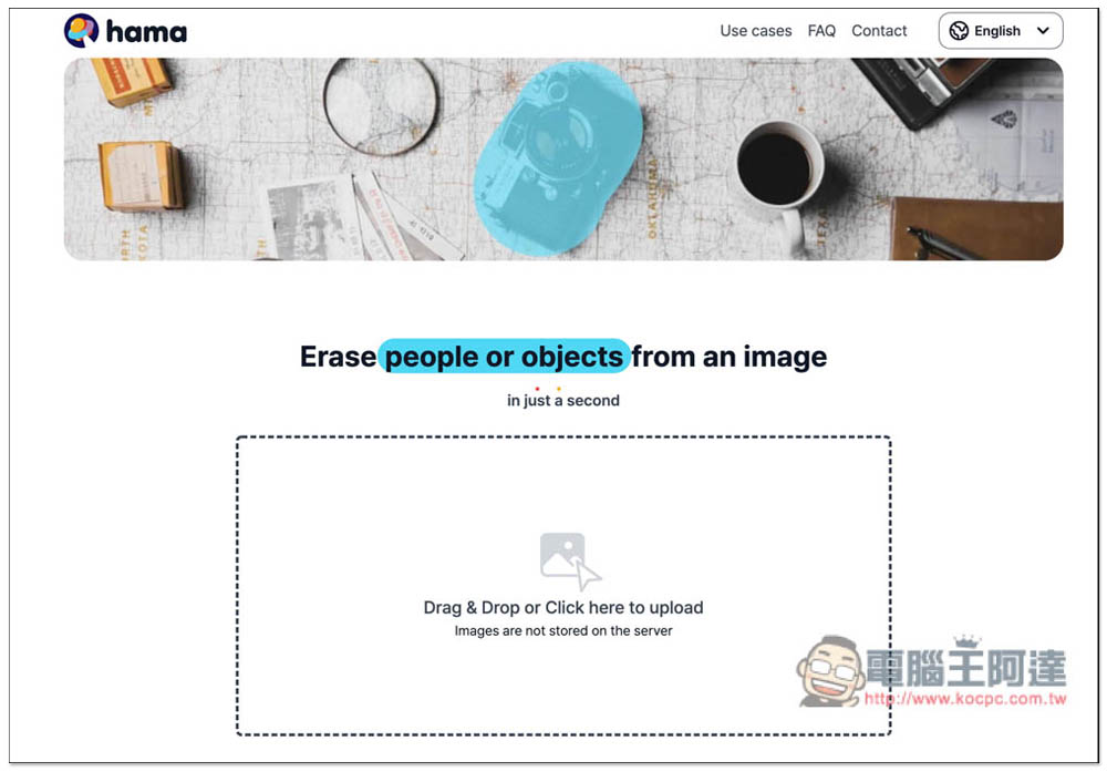 進到 Hama 線上工具之後,就可以把你要移除人事物的照片拖曳進視窗中,或點擊中間的框框,來手動選擇照片: