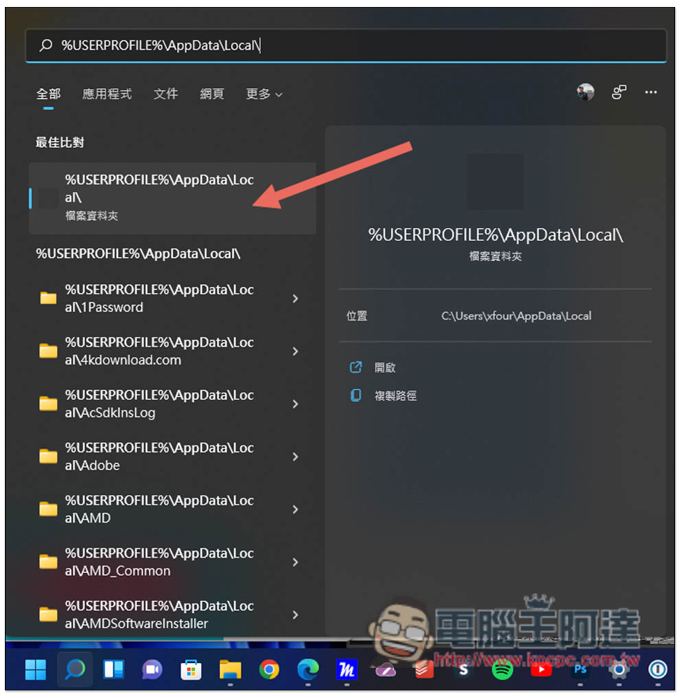 接著打開搜尋功能,輸入「%USERPROFILE%\AppData\Local\」這個位置,然後打開該資料夾: