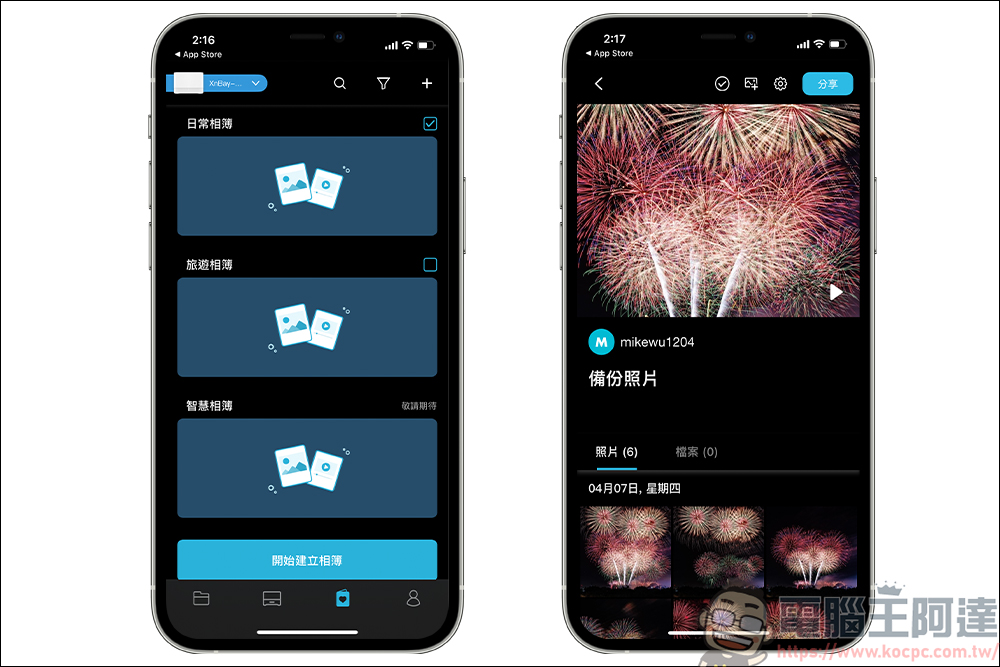 第三個相簿功能,你可以利用這個功能將相片一一的分類,同時還能透過分享連結的方式,讓親朋好友看到你拍的精美照片,上傳的同時也會在雲端硬碟中保存一份資料,方便你做整理: