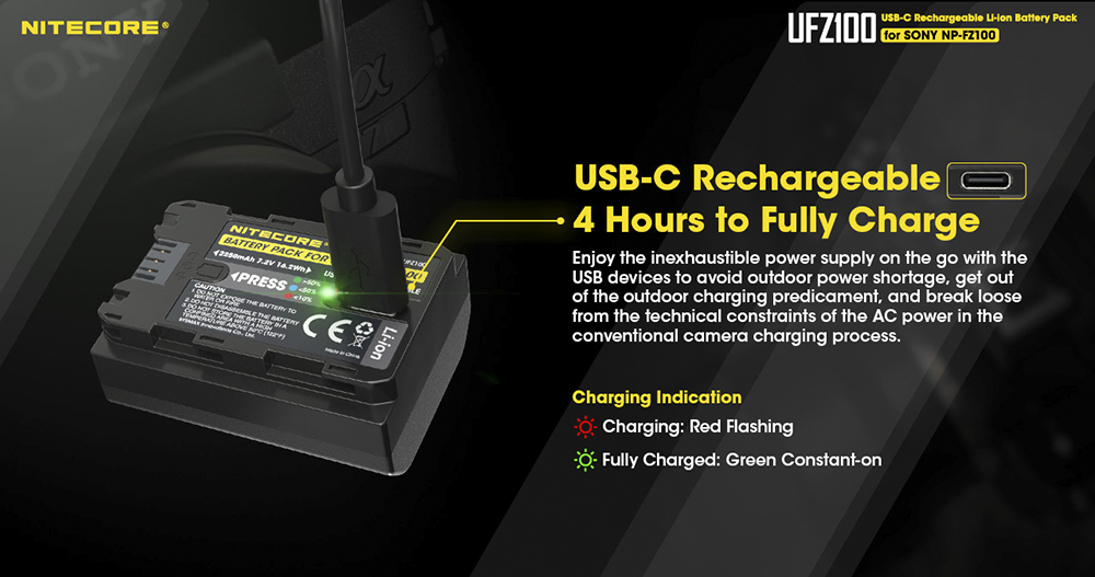 不得不說,其實在一般規格的電池加入 microUSB 或甚至新的 USB-C 充電插頭,讓你可以直接透過手邊有的手機充電器來快速進行充電,並不是什麼太新奇的產品(印象連一般 AA 電池都有出)。不過對於購入新世代 Sony 無反相機,像是 A7 III、A7S III、A7C 與 A6600 等機型使用的大電池 NP-FZ100 來說,好像就還沒有看過像是 Nitecore 最近宣布將會推出的 UFZ100 副廠電池這樣,直接為你放上 USB-C 肚臍充電孔的規格。