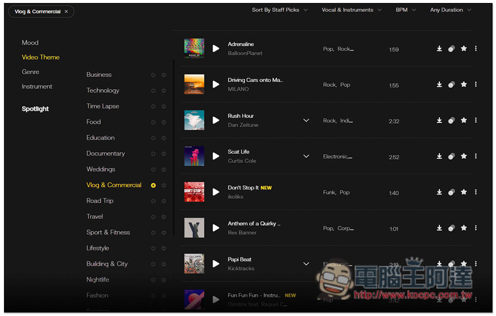 還有一個很多人一定會愛的 Vlog & 商業影片配樂分類,各種風格都有,搖滾、流行、放克、電子等,對有選擇障礙的人來說,這影片主題真的很讚: