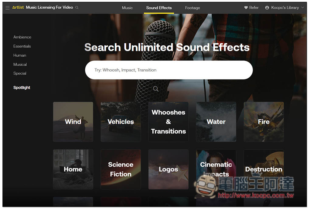 Artlist 的無版權音樂素材共有兩種,「背景音樂」與「聲音特效」,數量非常多,除了官方提供的音樂素材,也有一些國外專業音樂人會不定期在這網站上分享作品。