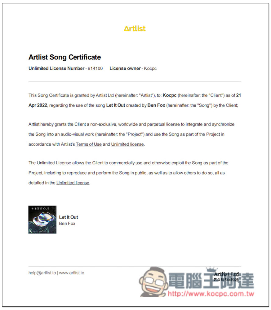 下圖就是授權文件的內容,會明確寫 Artlist 提供、什麼訂閱方案、客戶名字、哪一首音樂、什麼時候獲得這份授權文件:
