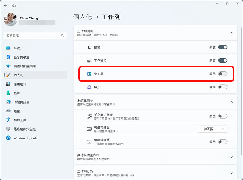 與 Windows 11 裡面大多數內容一樣,你可以在 Windows 11 的「設定」應用來調整其外觀或行為模式,當然也可以在其中關閉小工具。