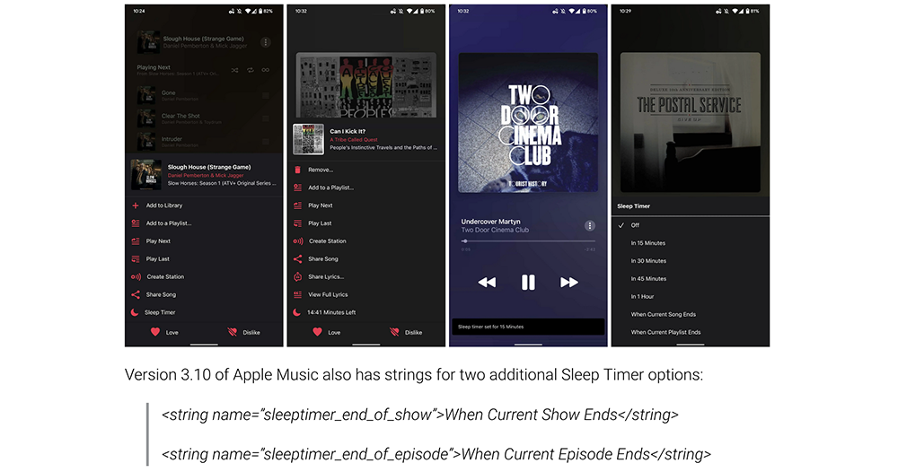 認真說,雖然時間倒數這件事在 iOS 那,也可以透過系統時鐘所提供的倒數計時器達到。不過對於 iPhone 使用者而言,就少了「直到目前的歌曲停止」與「直到目前的播放清單結束」的使用可能。更何況,9to5Google 發現這項功能在 APK 程式碼似乎還暗藏了可以支援 Apple Music 1 或廣播等節目的「當目前的節目結束(When Current Show Ends)」與「當此話結束(When Current Episode Ends)」的功能。