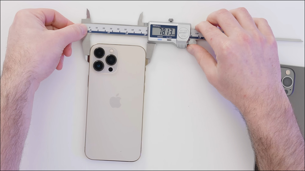 Unbox Therapy 主持人 Lewis Hilsenteger 拿出專業儀器測量這兩台 iPhone 的尺寸,首先在 iPhone 13 Pro Max 的機身寬度約為 78.13mm(官方數據為 78.1mm)。