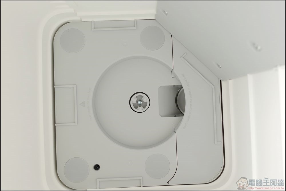 上蓋用以安放乾燥盒的位置也有劃鎖頭的指示,先將三角形對著未鎖的位置合上後,再把乾燥盒向右旋轉就可以鎖上不怕它掉落進飼料裡頭,仔細發現類似這樣的防呆的定位點設計,小頑在這台機器上的每個設計細節都有做到,可以說是非常貼心。