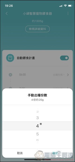 設定完成後即使人不在家也可以透過APP遠端確認飼料機的出糧狀況,可以看見飼料機的當天出糧份數,甚至也可以自行設定手動加糧,即使臨時因為其它原因需要較晚回家的時候也可以透過APP直接幫自己在家的貓咪加飼料,甚至也能自行決定手動出糧的飼料量份數,對於忙碌的上班族和寵物來說都是非常便利的工具。