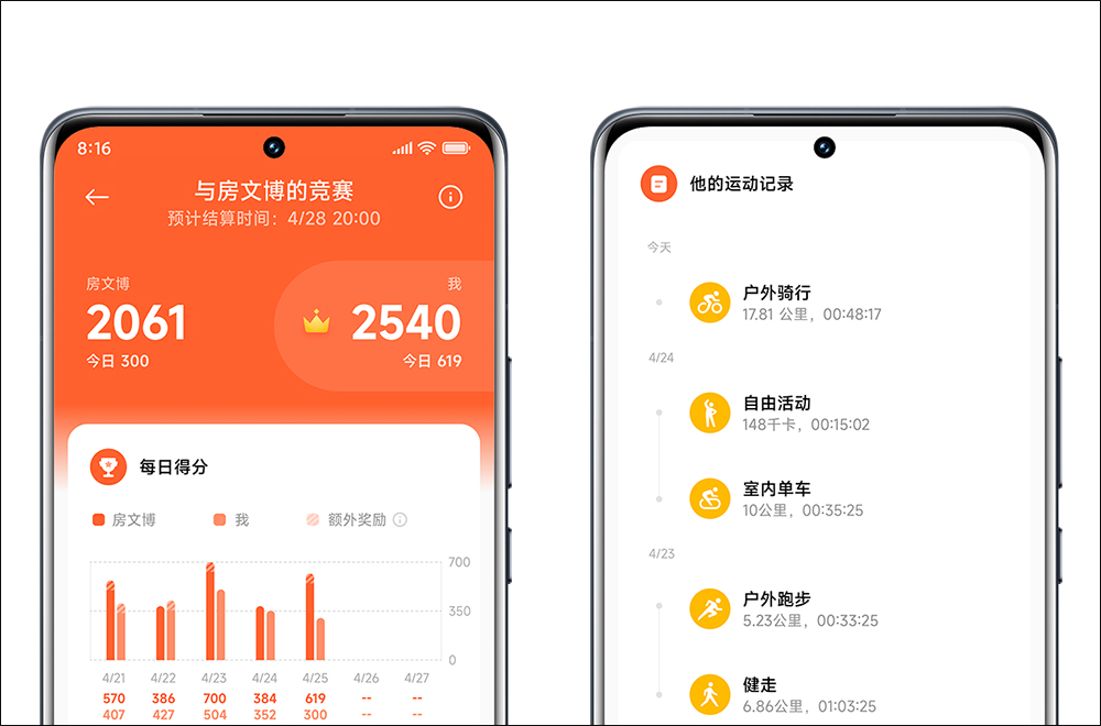 如果自己一個人運動無法持之以恆,小米手環 7 也能透過 App 設定每天的活動量,甚至更可選擇邀請好友挑戰、和好友比拼每天的步數、卡路里消耗、活動時間、戰力次數等,讓大家一起變健康。
