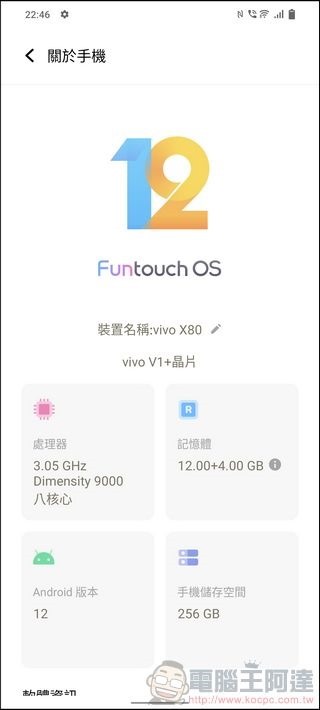 設定介面選項,搭載 Android 12 作業系統與 Funtouch OS 12,在處理器部分除了天璣9000以外,還另外備註了 vivo 訂製的 V1+ 影像晶片: