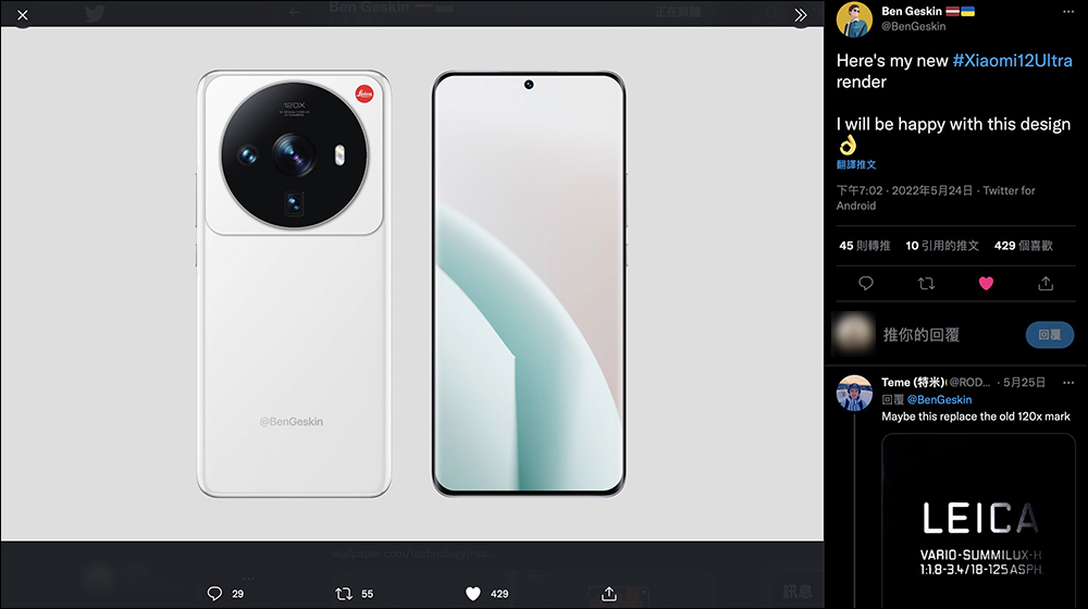 之前製作過許多手機概念渲染圖的 Ben Geskin ,也在小米正式宣佈與徠卡相機合作後,於隔(24)日在 Twtter 分享了他的渲染圖。這設計圖與過去網路流傳疑似小米 12 Ultra 的保護殼設計上大致吻合。