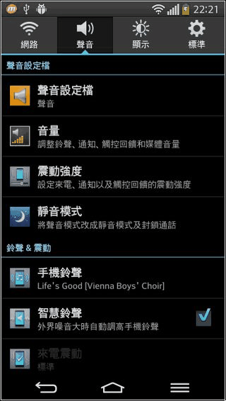 在「設定」介面部分,LG 共分為「網路」、「聲音」、「顯示」與「標準」等四個選項,方便使用者快速找尋相關設定: