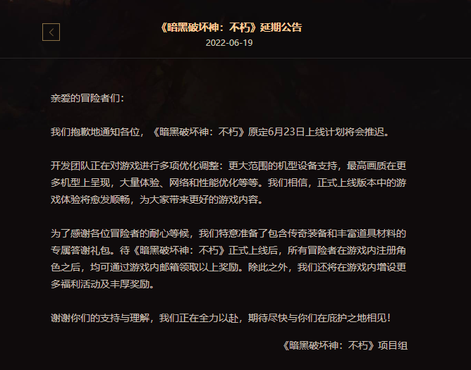 中國網易於 6 月 19 日突然宣布《暗黑破壞神:永生不朽》將延後上線,內文寫到: