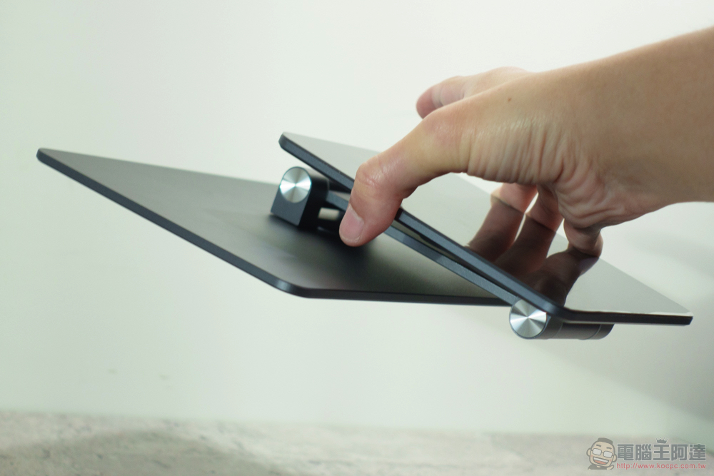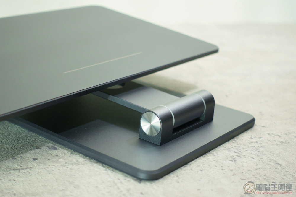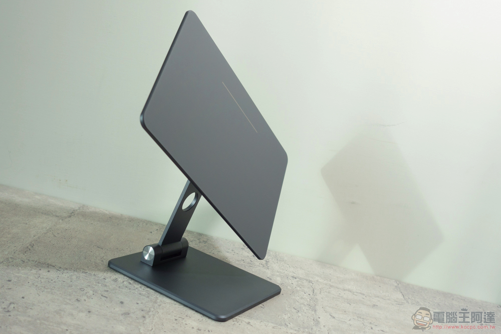 轉軸處的金屬質感滿滿,會與 iPad 親密接觸的磁吸支架平面也有絨毛的質感避免刮傷: