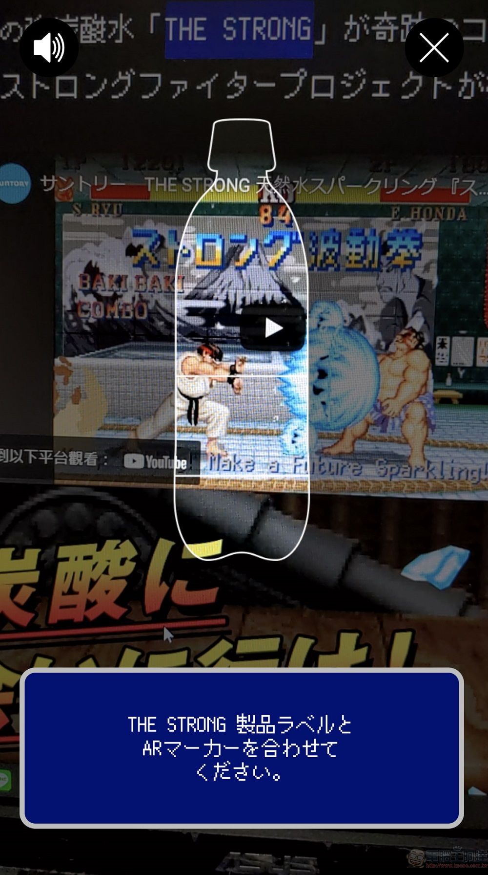 此次SUNTORY「The Strong 天然水 Sparkling」,與將迎來誕生 35 周年的《快打旋風 2》合作中,有不少讓人會心一笑的元素與結合,其中之一就是可透過手機遊玩的AR遊戲《Strong Fighter II》,玩家用手機掃描指定 QR code 於特設頁面選擇角色,並掃描「The Strong 天然水 Sparkling」瓶身(可直接掃描螢幕的飲料大圖)後即可開始遊玩。