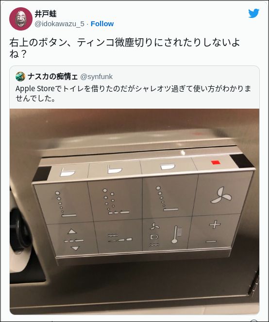 廁所是生活中重要度僅次於床的地方,一個精美的廁所,對許多人來說意味著要有個智慧化的馬桶,除了一個按鈕就能脫水以外,還要能作到加溫、清洗等功能,在這方面可說是世界級領頭羊的,想必也只有日本了。有位推特網友在日本 Apple Store 借廁所時,發現了一個驚人的設計。他們的免治馬桶面板有著奇妙的圖案,設計之奇詭,甚至難以讓人聯想到按鈕本身代表的功能。網友將這些圖案分享到網路上,也引來了許多人的哄笑,稱這些按鈕確實與現實中常見的免治馬桶面板有著極大的差別。