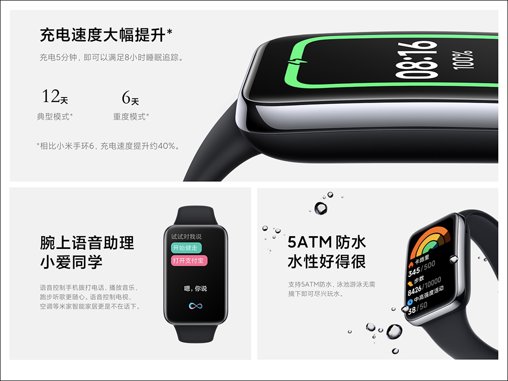 小米手環 7 Pro 在電量方面內建 235mAh 容量鋰電池,官方公佈的續航成績一般使用最長為 12 天,而這次小米手環 7 Pro 採用磁吸快充提供最便利的充電體驗,搭配快速充電只需充電 5 分鐘就能充滿足夠 8 小時睡眠追蹤的續航。另外,小米手環 7 Pro 也支援 5ATM 防水,無論是在生活場景或是泳池游泳都更從容。
