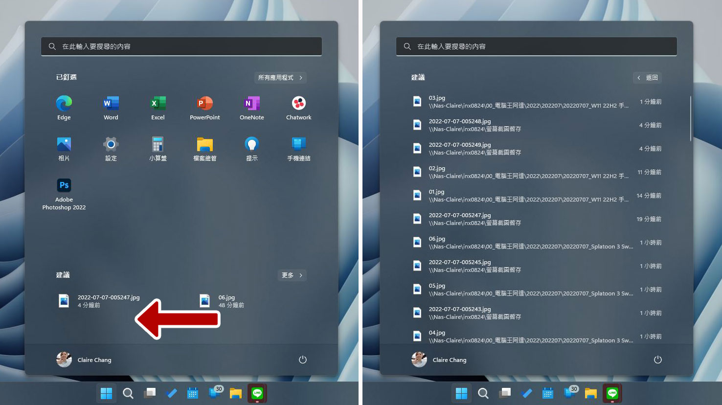 如果在下面「建議」區域向左滑動,則可以看到到所有最近你使用的文件和應用程式清單,你可以在清單中上下滑動來瀏覽;向右清掃則回到開始功能表最初的主頁。