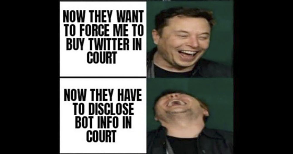 今天 Elon Musk 透過梗圖的方式,以自己的各種「爆笑/笑翻」來表示自己對整件事情的態度,甚至還點出當 Twitter 喊告之後,他們將不得不全盤托出機器人的數據了 這樣的好處。坦白講,說他是狂人真的毫不為過,根本笑死無誤 – 而且這張圖還是發在 Twitter 上,要是官方不爽刪掉那也就等於中了「箝制言論」的陷阱牌,根本動彈不得 XD。