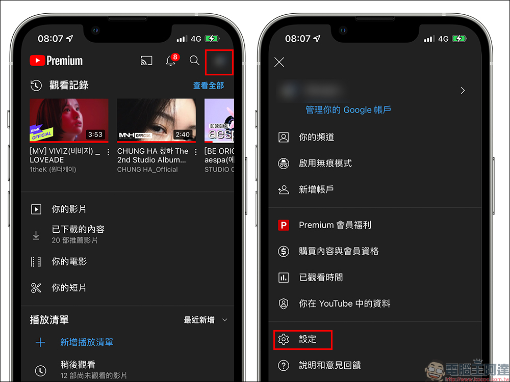 首先 iOS 用戶只要開啟 YouTube App 前往「媒體庫」頁面,接著點選畫面右上角「個人檔案圖示」>「設定」: