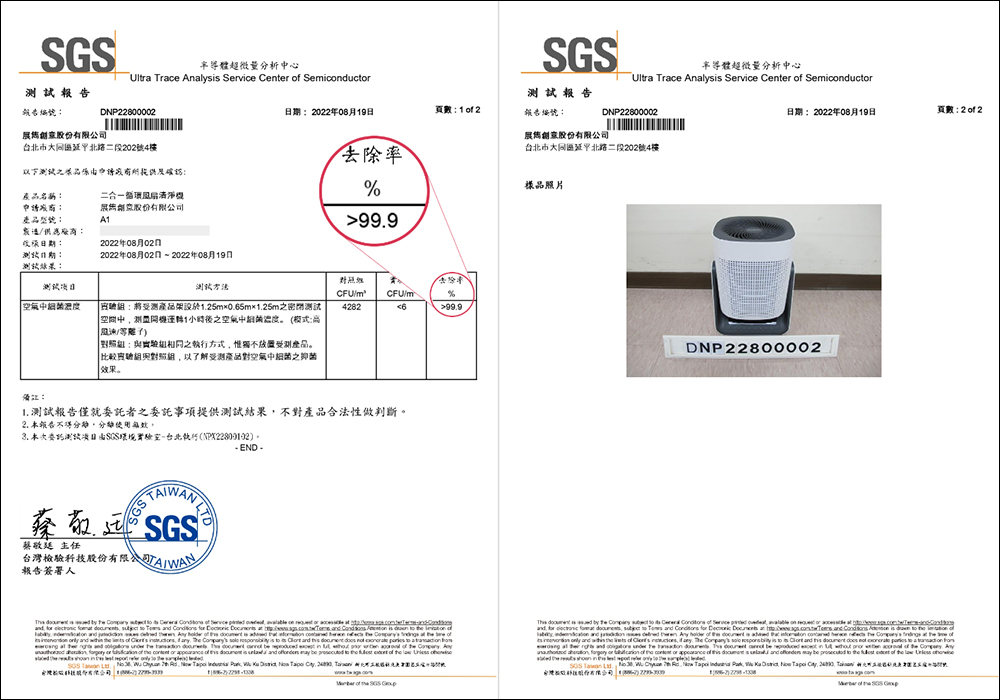 幫康 A1 循環清淨機也已取得 SGS 認證: