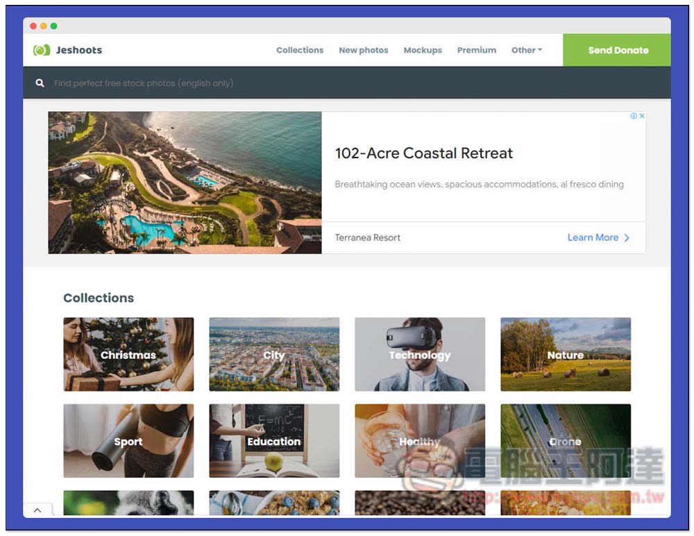 進到 Jeshoots 網站之後,功能選單位於最上方,你可以直接從這邊找,也能輸入關鍵字來尋找你要的圖片,僅支援英文: