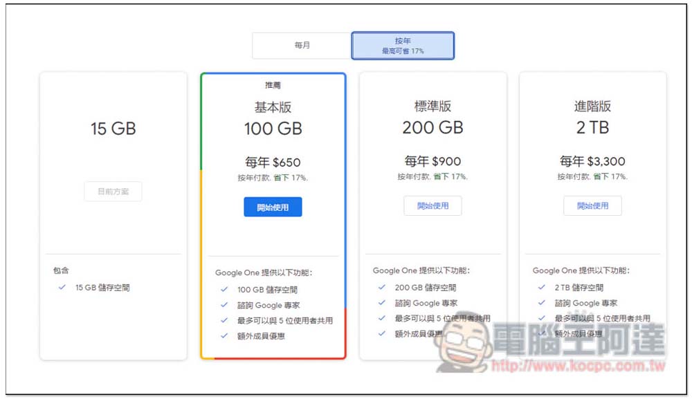下圖是台灣 Google One 年付方案(月付更貴),2TB 高達 NT$3,300 / 年,即便是 100GB 也要 NT$650 / 年,代表說訂閱土耳其 Google One 2TB 方案,比台灣 100GB 還要便宜: