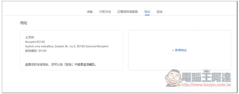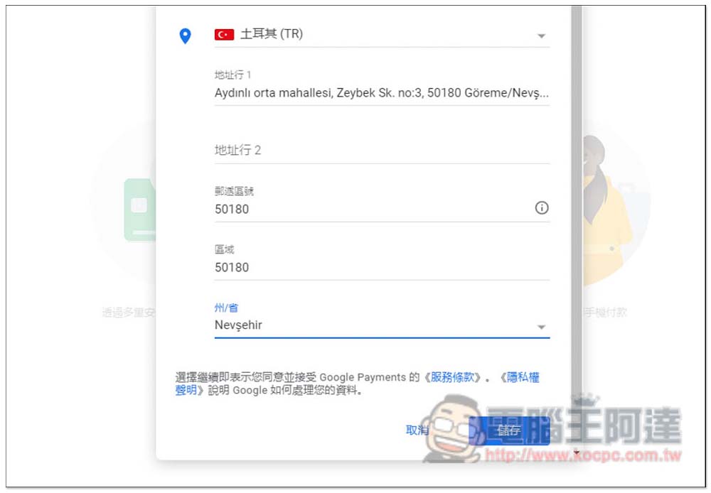 打開新增信用卡或簽帳金融卡畫面之後,建議先按一下帳單地址,把國家改成土耳其,然後在輸入上方的卡號、持卡人姓名以及帳單地址,可以輸入台灣信用卡: