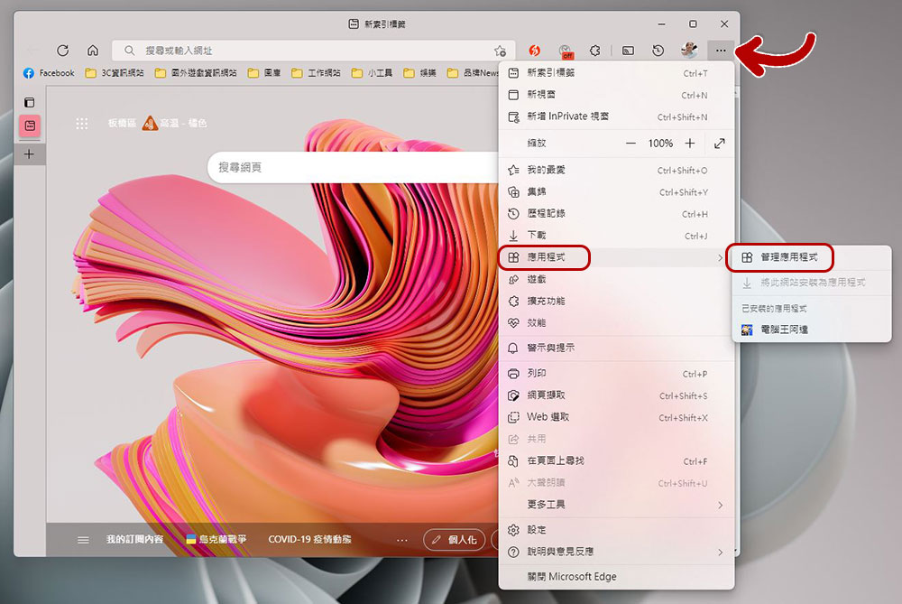 - 點擊 Microsoft Edge 瀏覽器右上角的三點選單,從「應用程式」這項中選擇「將此網站安裝為應用程式」。