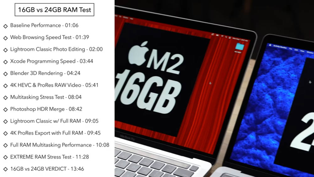 近日知名 YouTube 頻道 Max Tech 分享 16GB bs 24GB RAM M2 MacBook 的測試影片,他們使用的 M2 MacBook 雖然是 Pro 版本,但基本上也套用在 M2 MacBook Air。