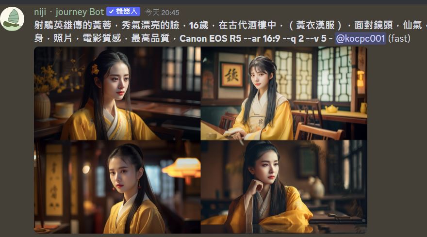 用 nijijourney 有一個優點,就是它支援中文敘述,如以下的內容就是用中文的咒語所畫,不過要畫擬真人物就是最後加上「–v 5」不然會畫出動漫人物: