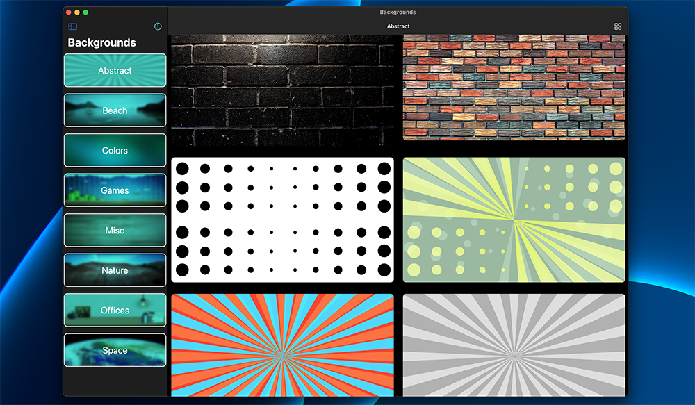 《Virtual Backgrounds》可以透過簡單的點擊分類來尋找視訊用的背景圖片。預設是盡可能放大的排列方式,也能透過右上角切換成更好掌握縮圖模式。有興趣的朋友,可以到 App Store 下載使用。