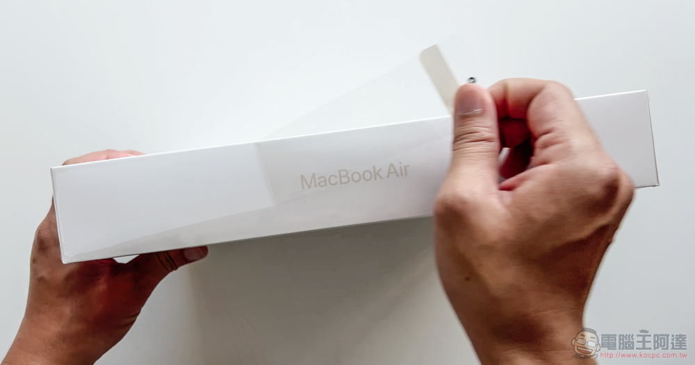 包裝上,M2 版的 MacBook Air 相對於 M1 與先前的 MacBook Air,由於不再強調前端極薄的楔形設計,改成直接將筆電展開秀出側面的部位。這也讓原本就超薄的機身,在包裝上更是存在感超低,好像有點不太確定你買了什麼東西的感覺(XD)。
