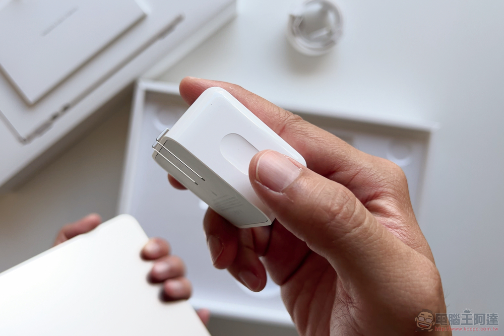 這個充電器的設計除了擁有插頭可收折設計外,可以看到這顆 35W 充電器的出充電埠還改了個方向。還在窄邊加入了小小的凹槽,讓插拔可以更就手、更省力些。這個充電器還有個很讚的小功能,就是插拔線的時候,並不會有重新握手斷電的狀況。