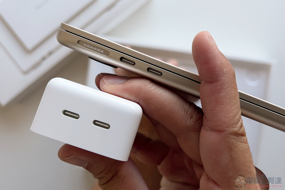 不僅是 MagSafe。高階版配的這組雙 USB-C 充電頭,我覺得也展現出了蘋果想幫 MacBook Air 使用者,解決連接埠相對較少的問題的方向 – 應該比在機身上再榨出空間來塞連接埠簡單?或者就是給消費者自己選配的概念了。