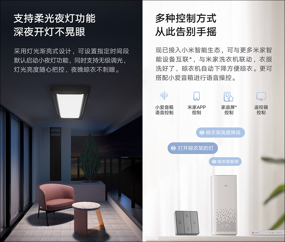 此外,米家智慧晾衣機 Pro 採用燈光漸亮設計,能設定指定時段預設啟動小夜燈功能。米家智慧晾衣機 Pro 也能與米家智慧設備進行互聯,還能搭配小愛音箱進行語音操控。