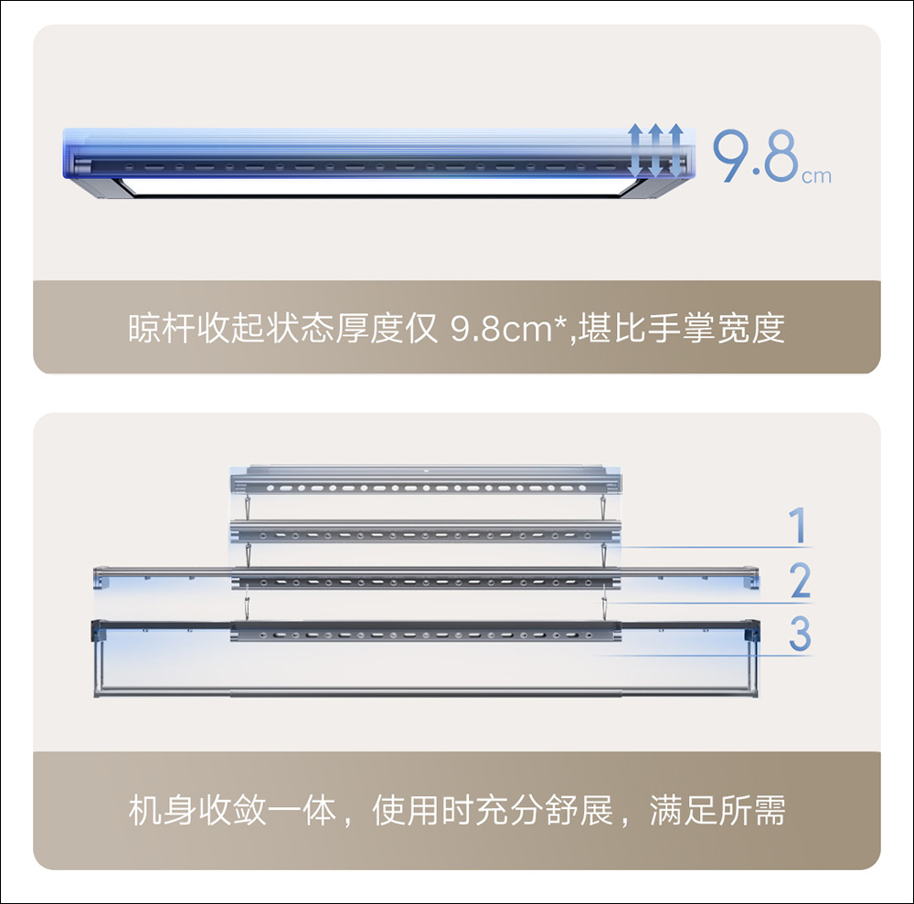 米家智慧晾衣機 Pro 收起狀態機身厚度僅 9.8 公分。