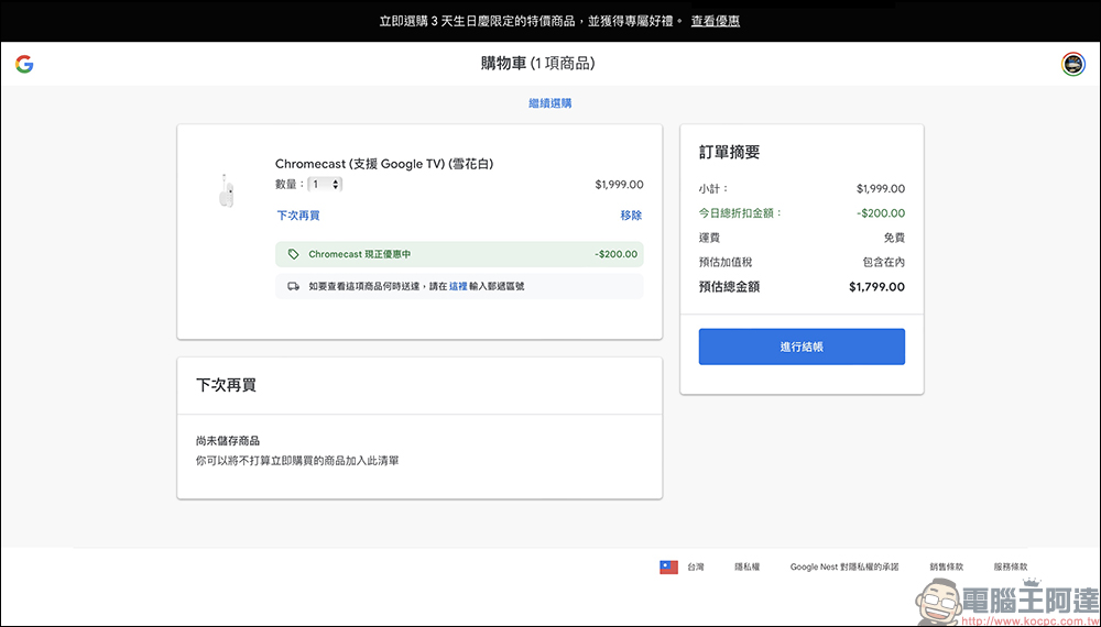 Chromecast(支援 Google TV)原價 NT$1,999 ,在這次 Google 生日慶限省 NT$200 只要 NT$1,799 就能入手。