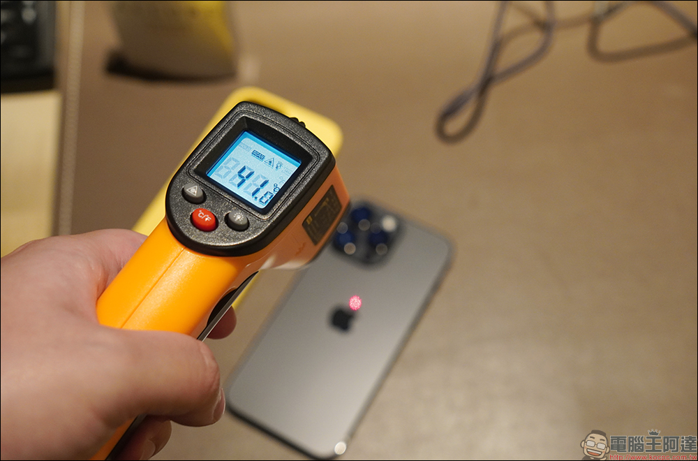卸下手機殼後,實測 iPhone 14 Pro Max 機身背面的表面溫度為 34.5°C(比使用原廠殼的溫度低了 6.5°C):