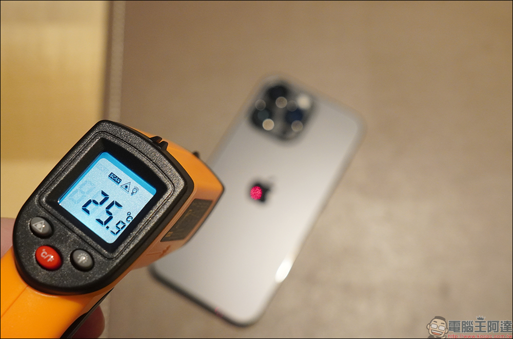下一步換使用安裝 JTLEGEND DX Pro Kooling 超軍規防摔散熱殼的 iPhone 14 Pro Max 來玩遊戲。開始遊戲前,先等待 iPhone 14 Pro Max 機身背面的表面溫度降到一樣的 25.9°C 才裝上手機殼進行測試: