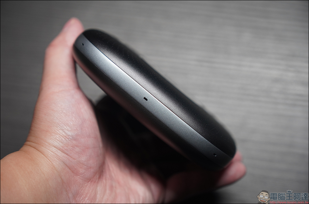先來瞧瞧 AnkerWork PowerConf+ 無線會議麥克風揚聲器的外觀設計,採用圓潤的扁形機身與低調的灰黑色搭配,機身正面外殼有大面積的揚聲器開孔,中央則有觸控操作的按鍵能控制接聽/掛斷/拒接通話、音量調整等操作。